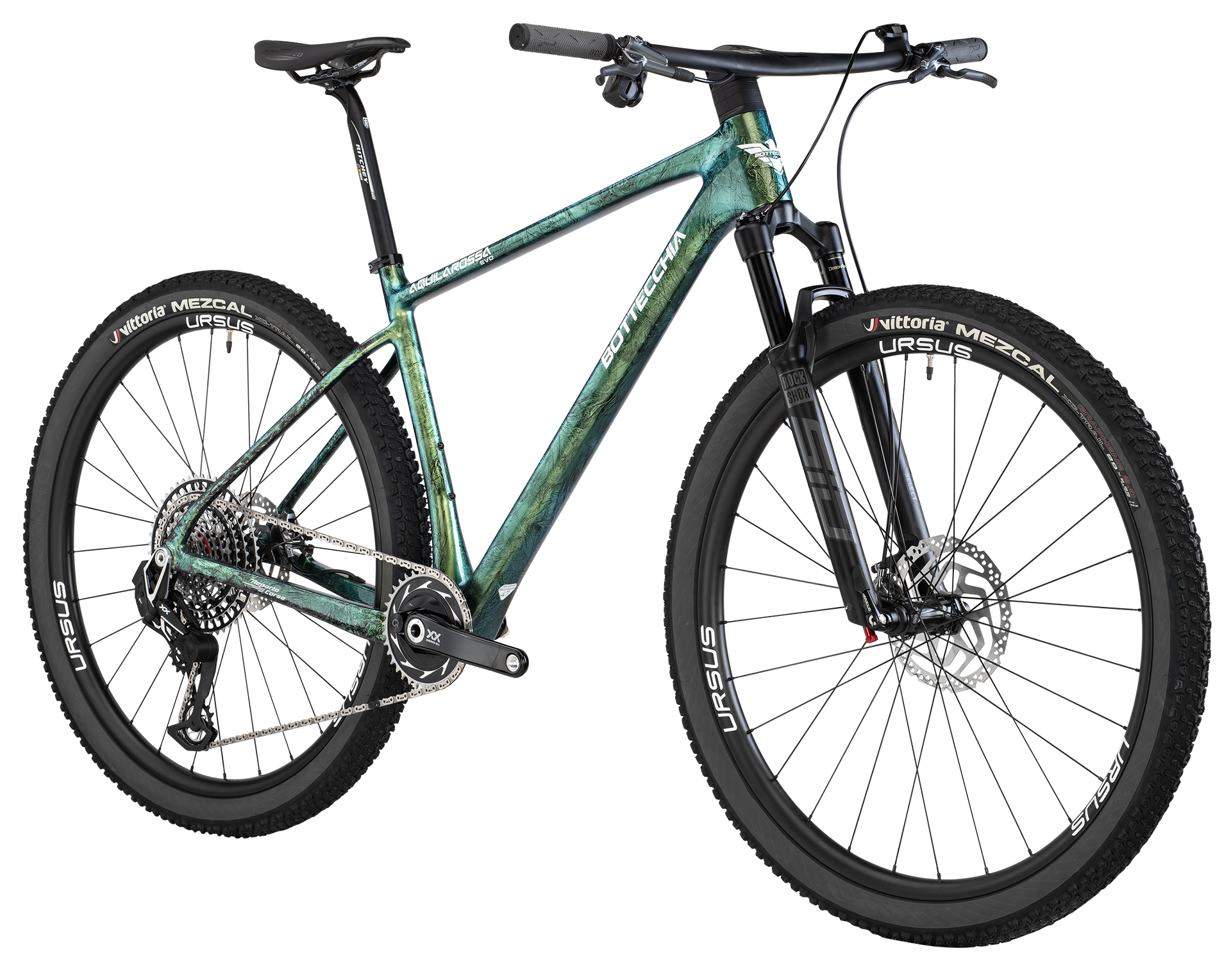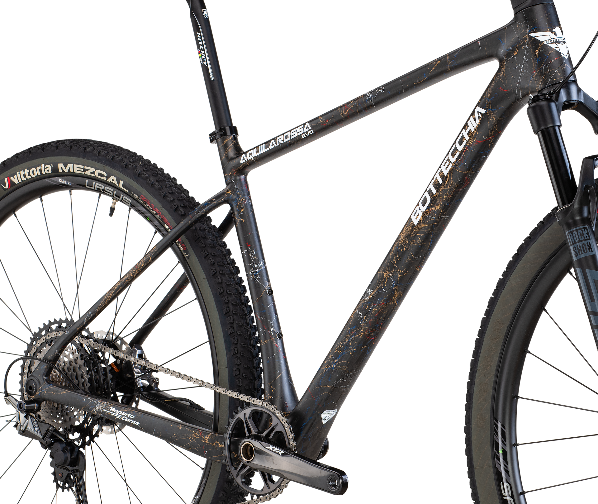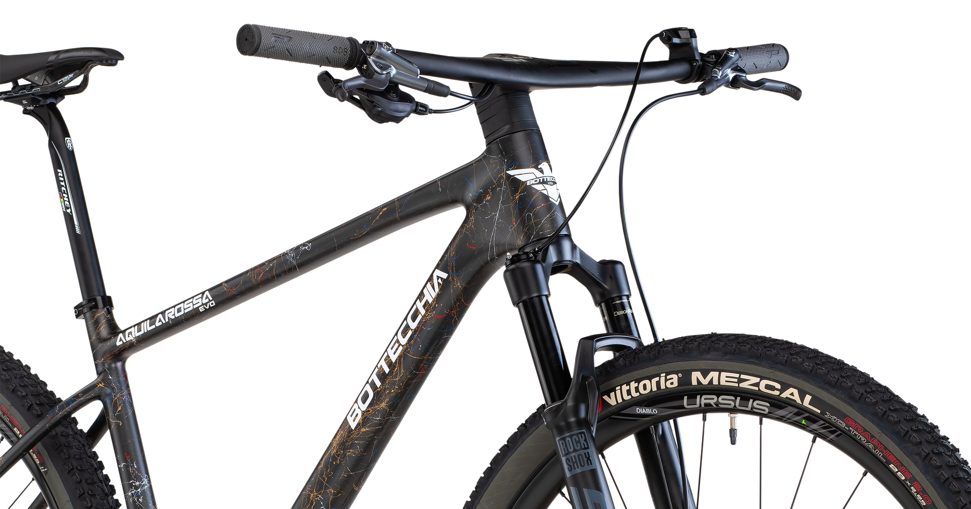 New frame for AQUILA ROSSA EVO, the hard tail for competitions, designed for the mountain bike athletes. Official bike of the Bottecchia Factory Team, it allows you to face the most treacherous climbs with efficiency, and to conquer the fast descents in total safety. The super light frame is made of high-modulus carbon UD monocoque, extremely responsive and durable, it offers safety and great maneuverability to master even the most challenging tracks. The HPG (High Performace Geometry) is designed for trails with a perfect seat stay angle for the climb, and a head tube inclination designed to increase stability and control even on more technical descents. The review of the rear stay gives to the new AQUILA ROSSA EVO greater reactivity in raising and efficiency on the climb. The suspension fork with 100mm of travel absorbs bumps from the roughness of the terrain, while the 2,25 mm tires increase traction on rough paths. New predisposition for Sram UDH dropout, compatible with all transmission systems, which ensures greater protection of the gearbox and the frame in case of impact and allows a more precise adjustment of the rear derailleur.