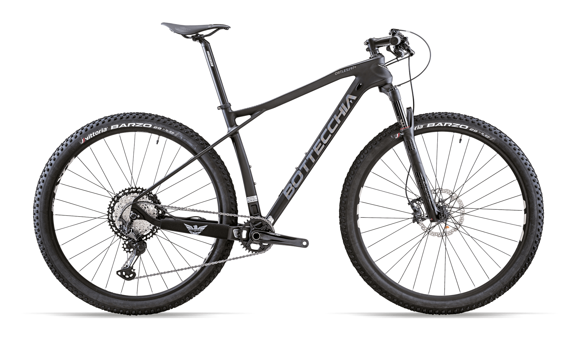 UD HM 29 monocoque carbon frame with 12mm thru axle, BOOST 148mm, predisposition for Di2 and PLUS 2.8. The rear stay is extremely compact and reactive and allows most of the rear vibrations to be discharged onto the top tube. Its Boost conformation with 148mm wheelbase is designed to perfectly support stress, guaranteeing exceptional performance in all conditions of effort. The possibility of using wheels from 29" up to 2.35 in section and the particularly stable and easy-to-handle front end make the ORTLES 297+ fast and smooth even on challenging surfaces.