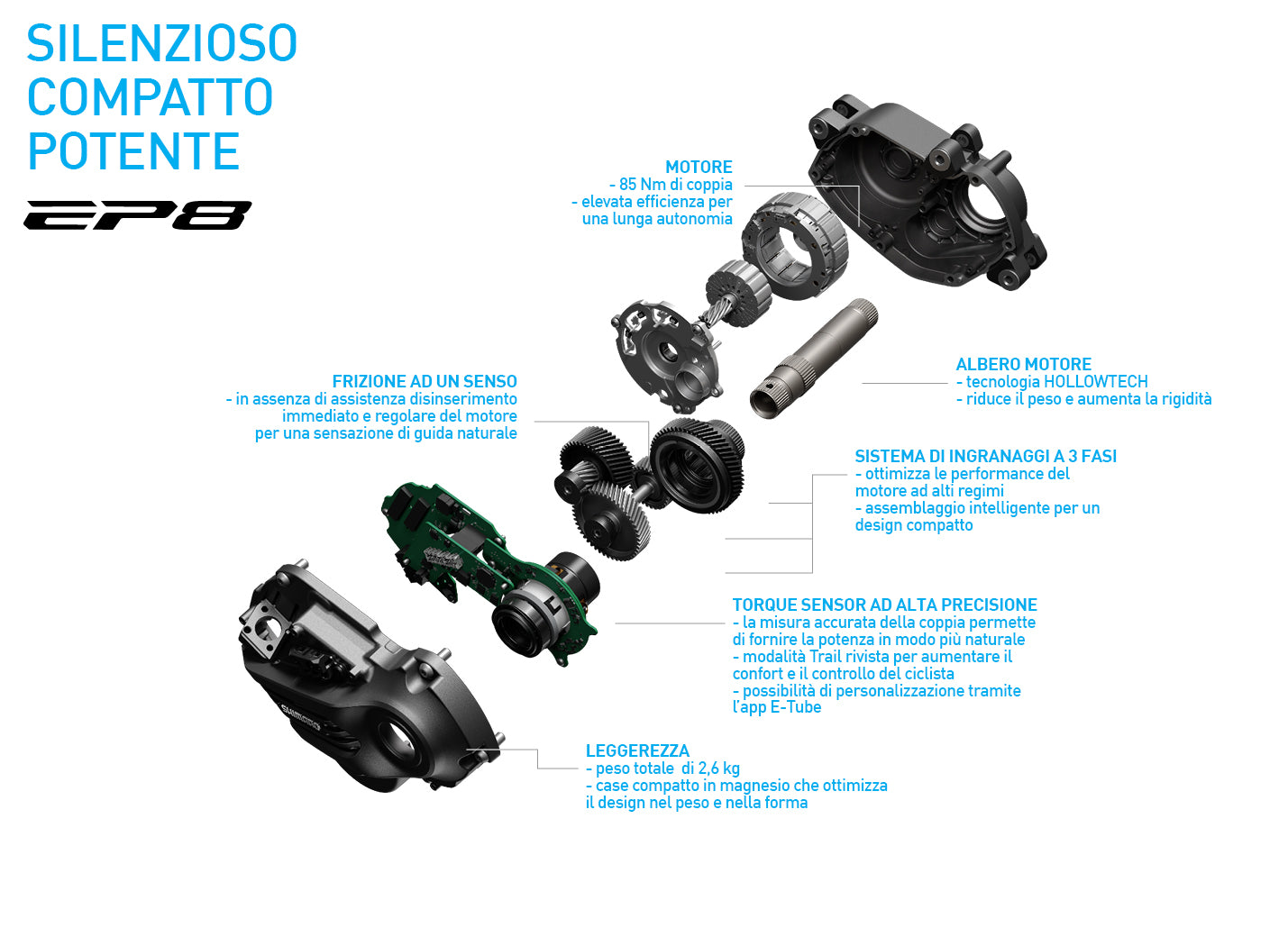 Con 2,6kg, il sistema EP8 pesa 300 grammi meno delle precedenti versioni. Si tratta di una delle unità motore più